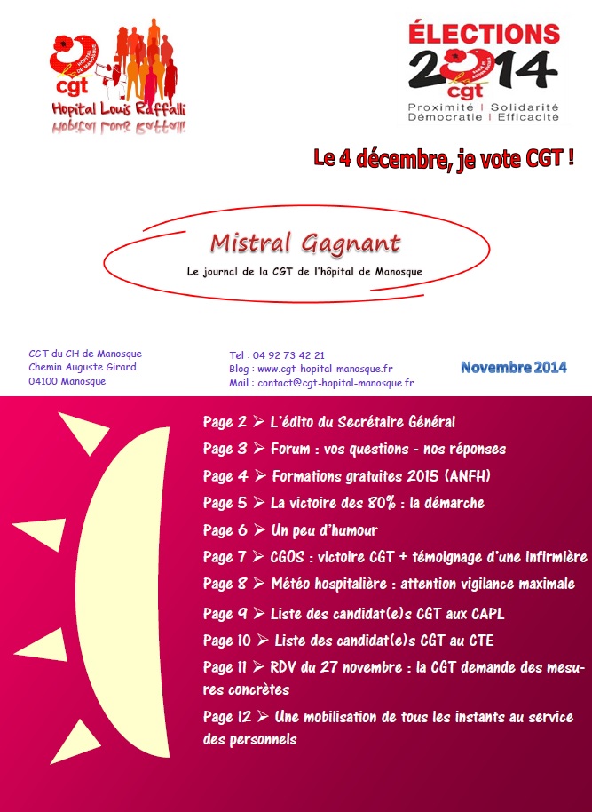 Le nouveau journal de la CGT du centre hospitalier de Manosque et de ses maisons de retraite vient de sortir. Le « Mistral gagnant » vous informe de vos droits et de l’actualité de la CGT de l’hôpital. Il est diffusé actuellement en masse dans les différents services, mais vous avez également la possibilité de le consulter et de le télécharger sur ce blog.