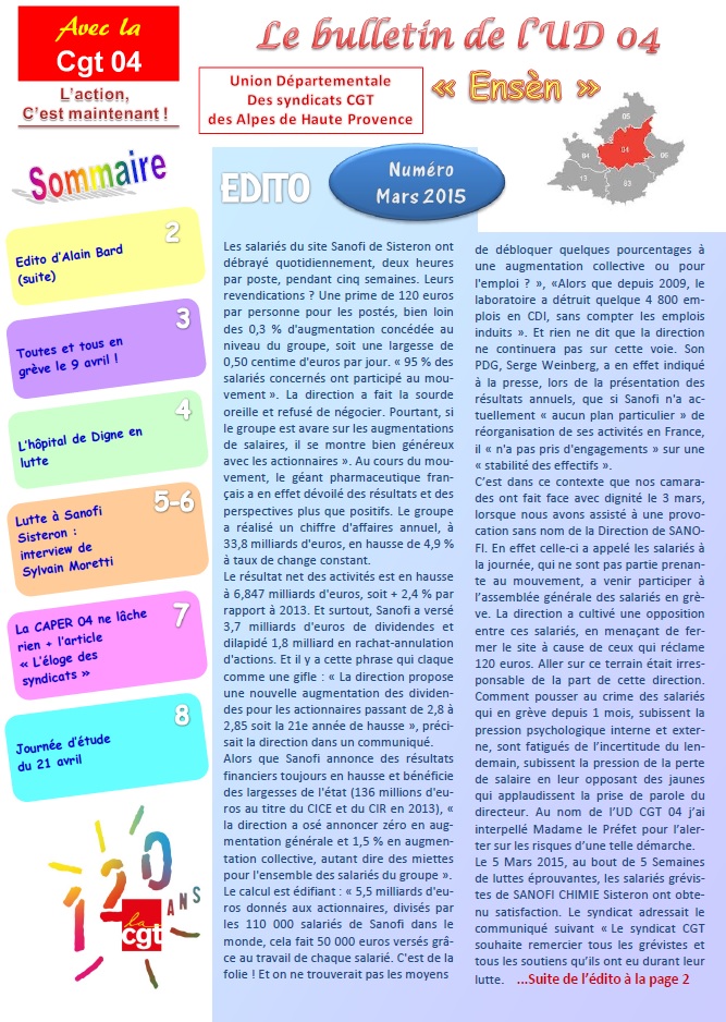 Pages 1 et 2 : Edito d’Alain Bard, SG UD CGT 04
