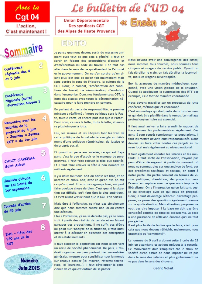 3 juillet 2015 – Le journal de l’UD CGT 04 du mois de juin 2015