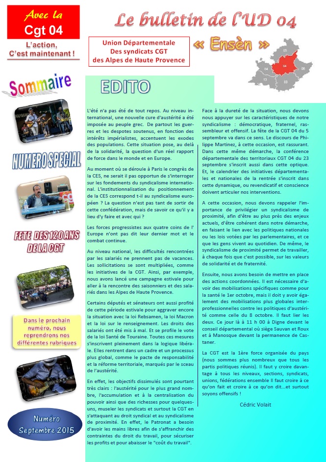 Pages 2 à 8 : Numéro spécial – Fête des 120 ans de la CGT – Grande fête de la CGT 04 avec la participation de Philippe Martinez le numéro 1 de la CGT