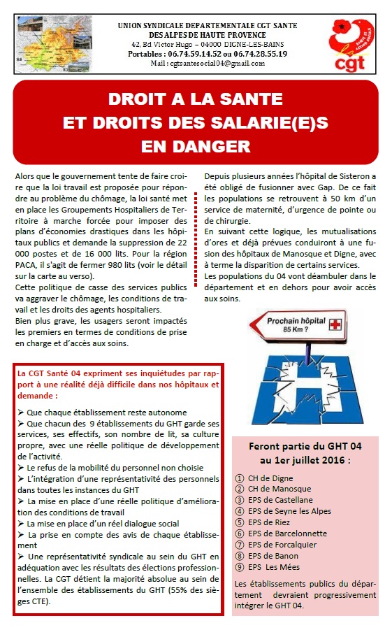 2 juillet 2016 – Tract CGT Santé 04 sur les GHT : Droit à la santé et droits des salariés en danger