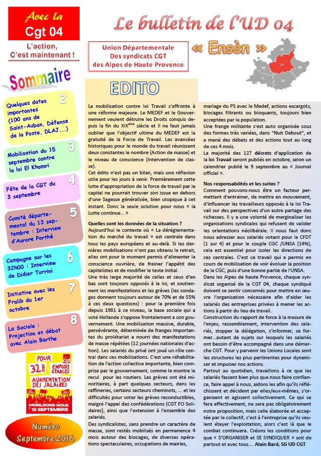 30 septembre 2016 – Le journal de l’UD CGT 04 du mois de septembre 2016