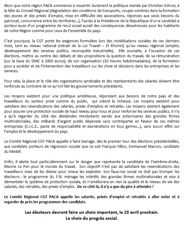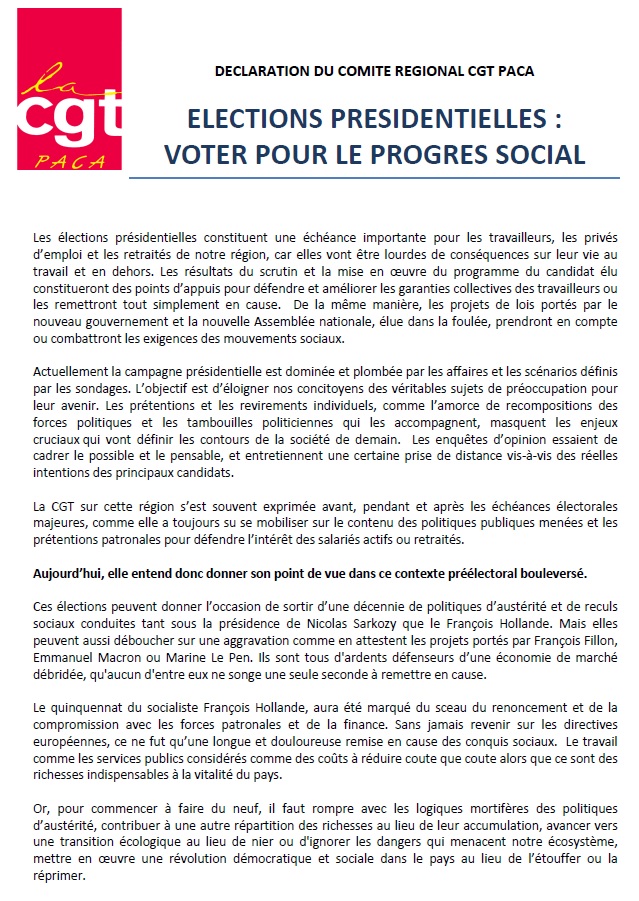 4 avril 2017 – Déclaration du Comité Régional CGT PACA – Elections présidentielles : voter pour le progrès social
