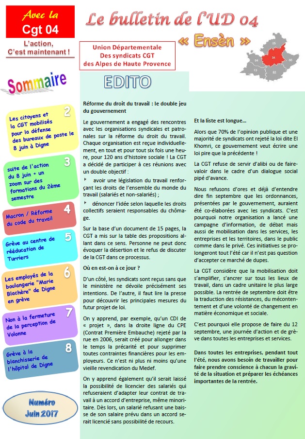 5 juillet 2017 – Le journal de l’UD CGT 04 du mois de juin 2017