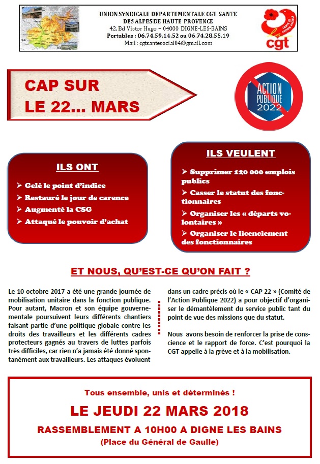 10 mars 2018 – Grève et mobilisation du 22 mars – Tract UD CGT 04 et Message CGT Hôpital de Manosque