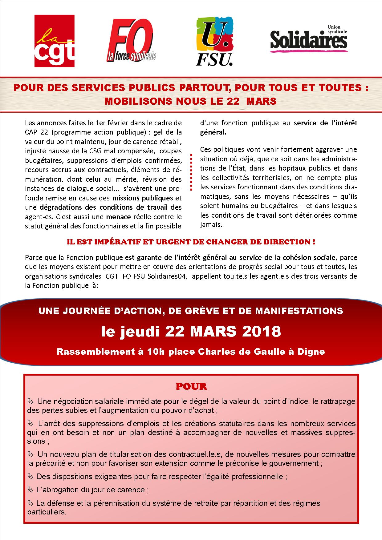 9 mars 2018 – Grève et mobilisation du 22 mars – Tract USD CGT Santé et Action Sociale 04