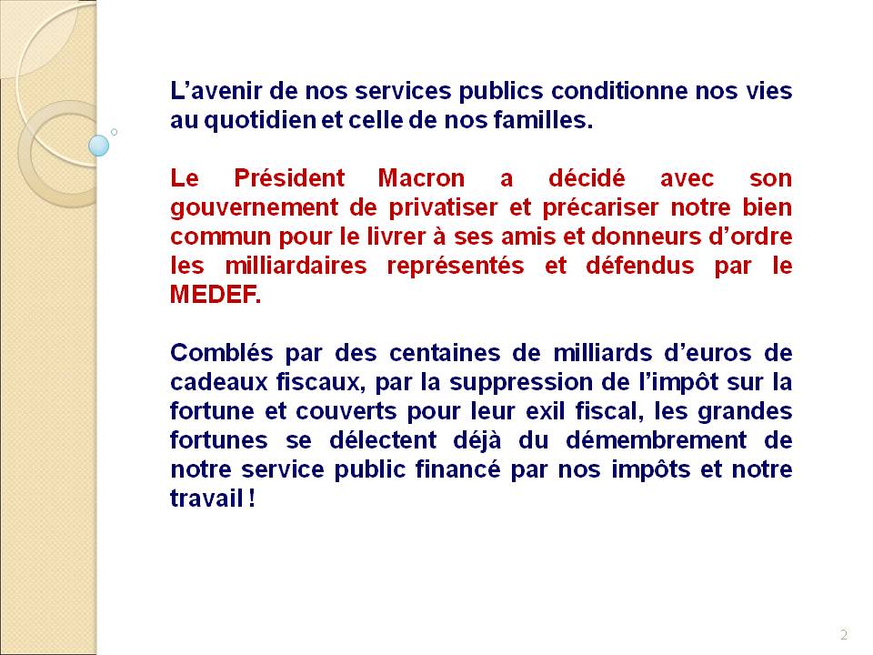 Les puissants de ce monde, le marché, ont mis au pouvoir Macron, pour appliquer une feuille de route précise : Déréglementer, appauvrir et démanteler les services publics, ouvrir tous les secteurs à la concurrence, détruire les protections des salariés et des citoyens. Il s’agit de casser les trois piliers de notre modèle social : Le droit du travail, la sécurité sociale et les services publics.