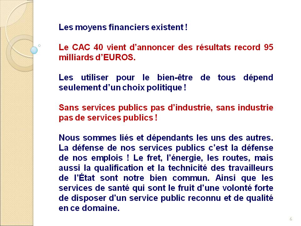 L’argent il y en a, et même beaucoup (la France est championne d’Europe des dividendes versées aux actionnaires) pour augmenter les salaires et assurer un service public de qualité !