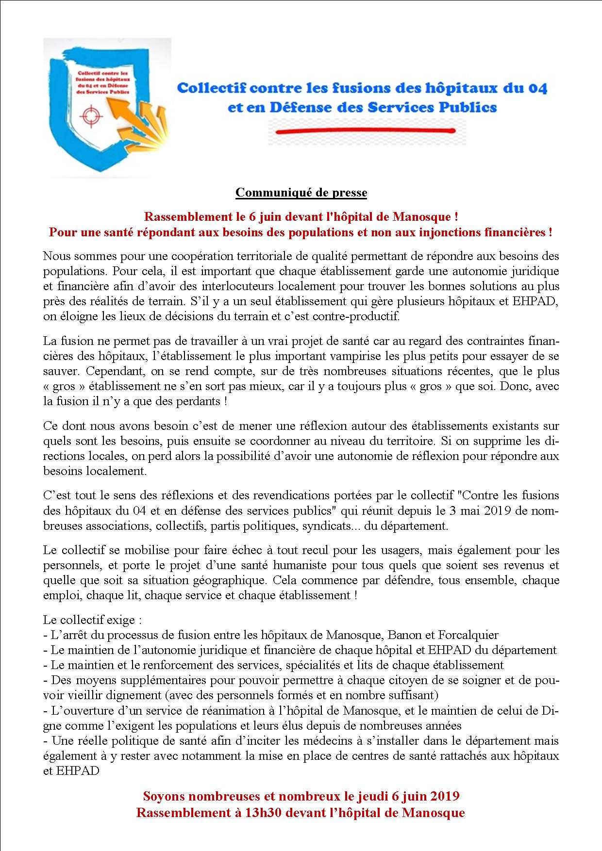 2 juin 2019 – Communiqué du collectif contre les fusions des hôpitaux du 04 et en défense des services publics