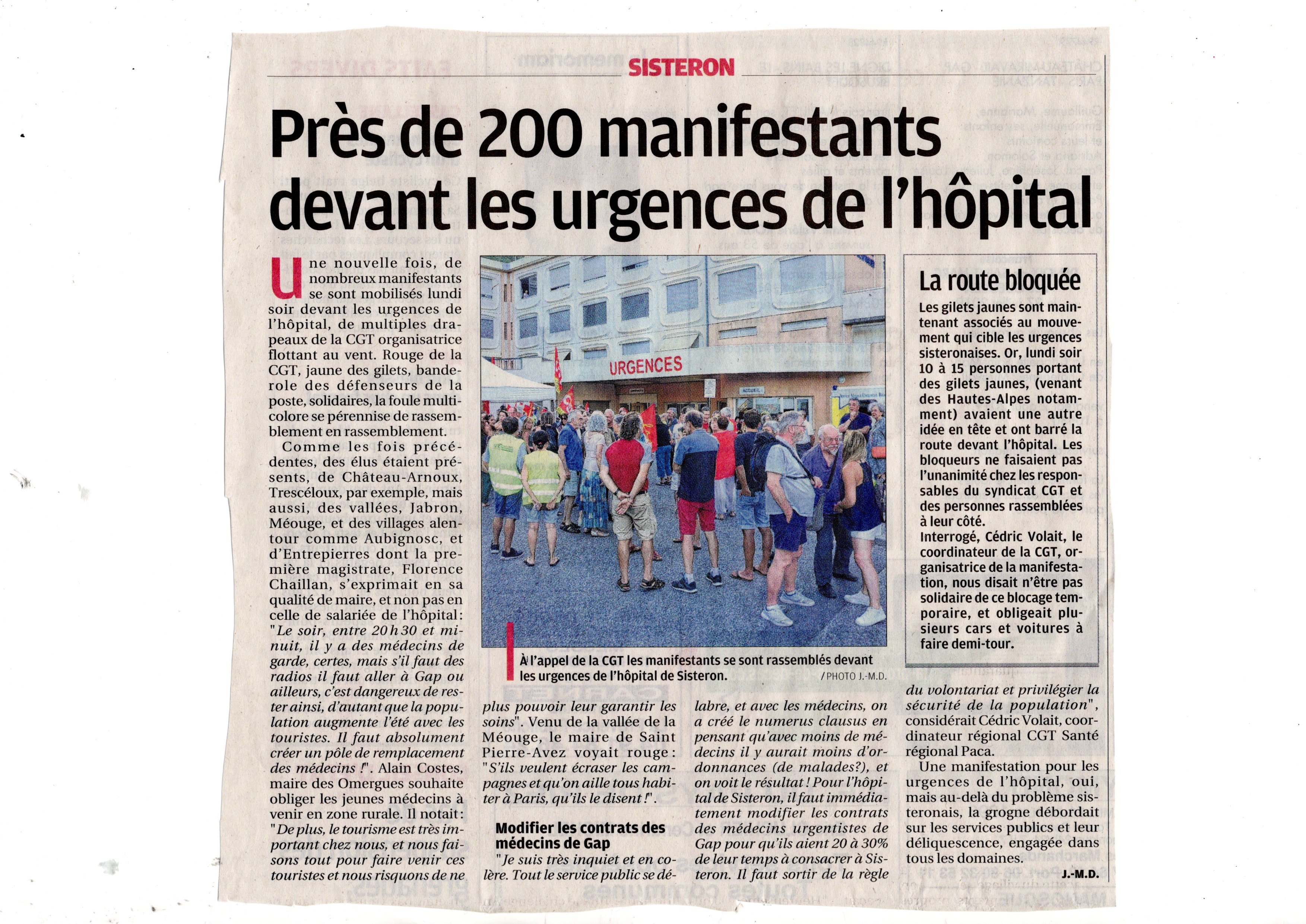 Quand le journaliste de La Provence est venu nous voir (ce n’était pas le même que les autres fois) pour demander si c’est la CGT qui appelait à bloquer la route, nous lui avons simplement dit que « la CGT appelle seulement à un rassemblement devant les urgences de Sisteron ». C’est la seule chose que nous lui avons dit. Après, nous en tant qu’organisation syndicale, nous ne pouvons pas appeler à bloquer une route officiellement, nous ne sommes pas couvert pour cela s’il y a un accident. D’autre part, dans un régime de plus en plus autoritaire nous devons être vigilant avec nos déclarations officielles car ils peuvent se servir du moindre faux pas pour interdire une manifestation.