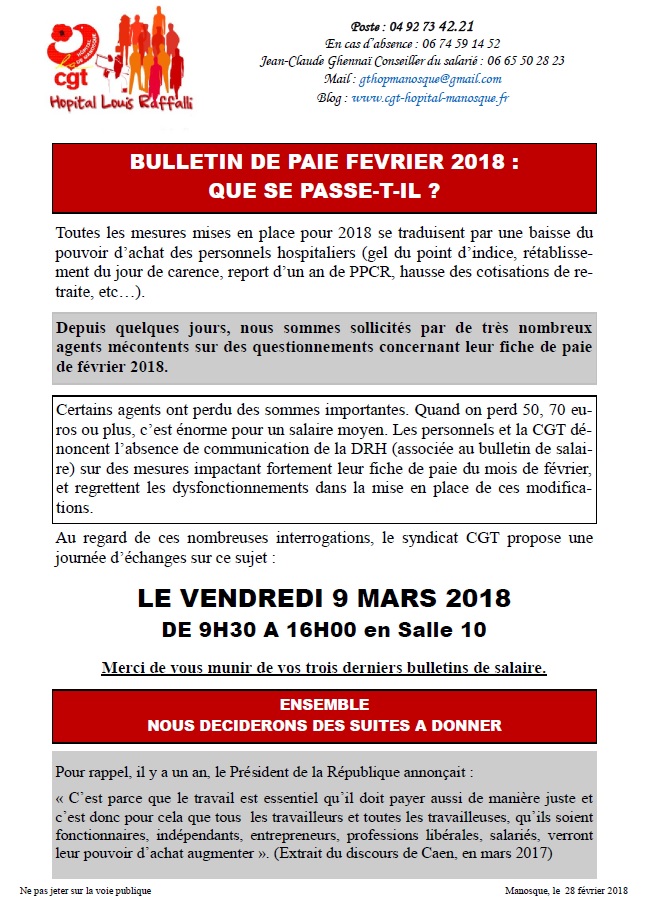 2 mars 2018 – Tract CGT hôpital de Manosque sur les bulletins de paie de fin février